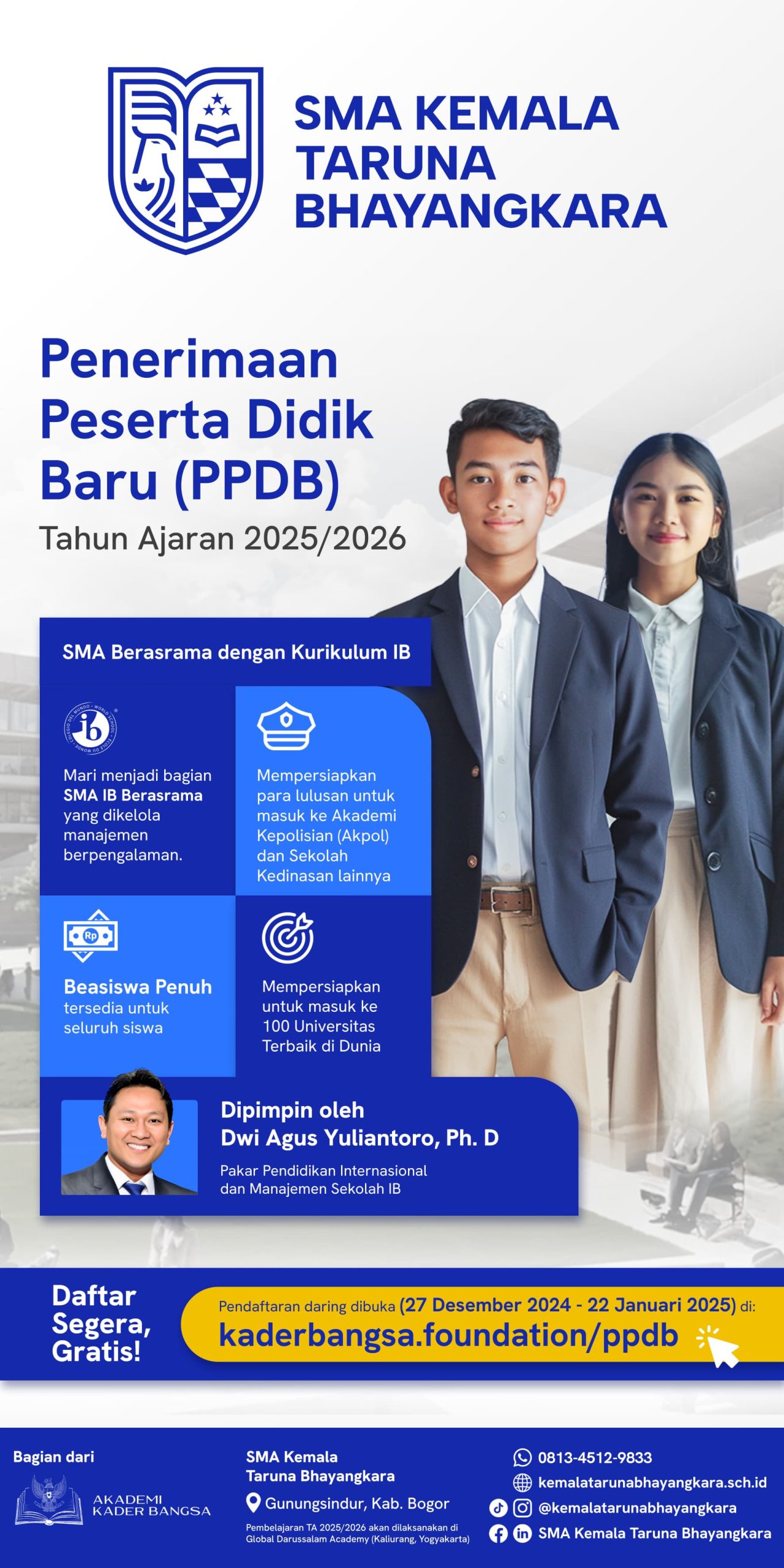 Pendaftaran dapat dilakukan melalui laman resmi kaderbangsa.foundation/ppdb. atau bisa menghubungi kantor Kepolisian terdekat.