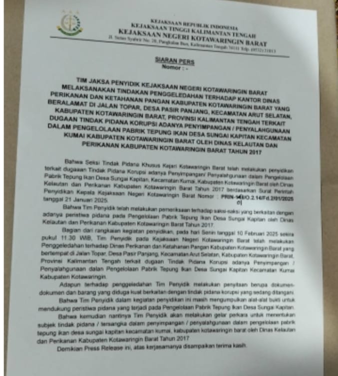 Dalam siaran pers kegiatan penyidikan, pada hari Senin tanggal 10 Februari 2025 sekira pukul 11.30 WIB, Tim Penyidik pada Kejaksaan Negeri Kotawaringin Barat telah melakukan Penggeledahan terhadap Dinas Perikanan dan Ketahanan Pangan Kabupaten Kotawaringin Barat. Dalam penggeledahan itu tim penyidik menyita sejumlah dokumen dan barang yang diduga kuat berkaitan dengan tindak pidana korupsi yang sedang ditangani.