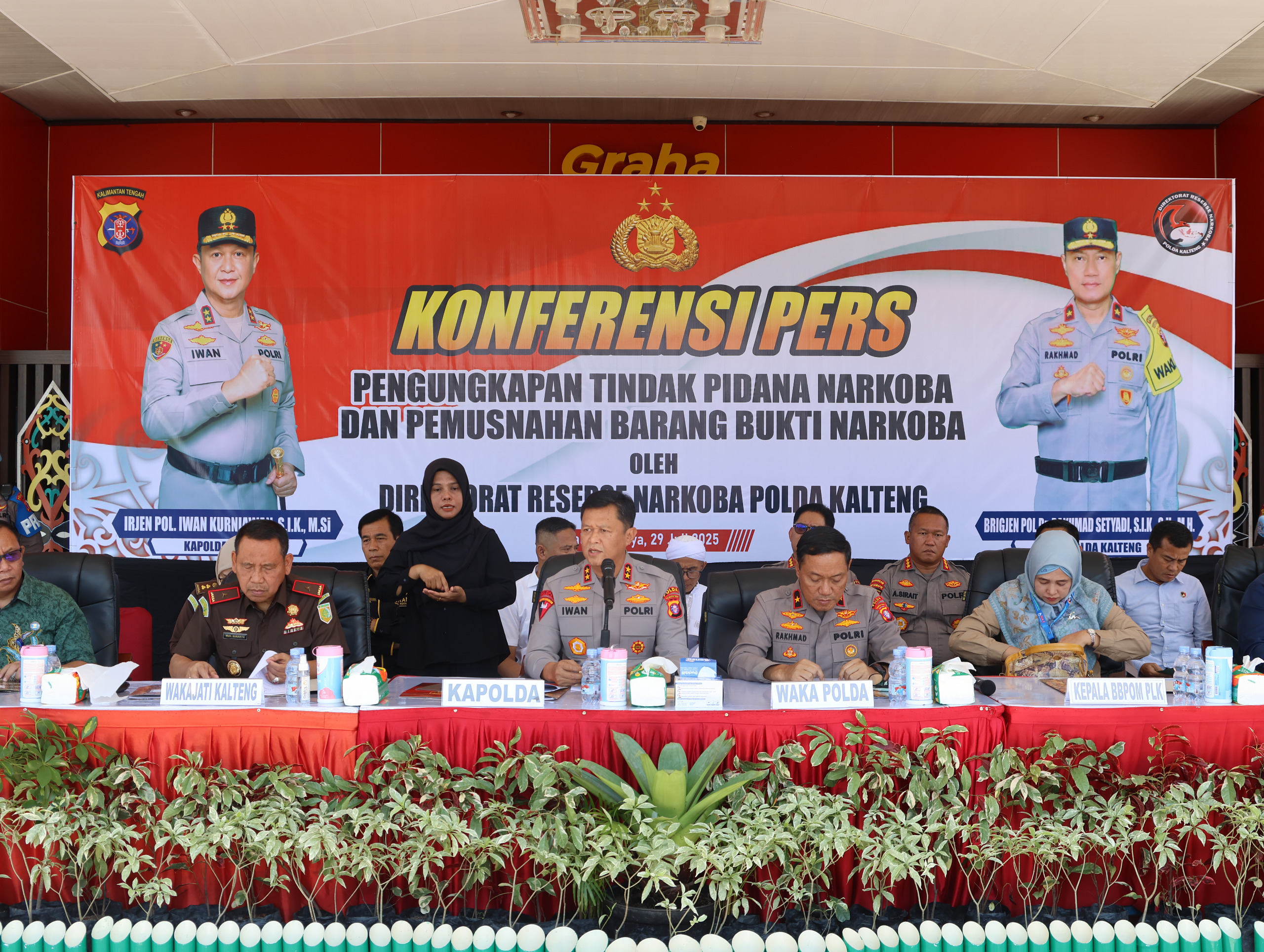 Mentayapos.co.id // Palangka Raya – Kepolisian Daerah Kalimantan Tengah (Polda Kalteng) menggelar konferensi pers pengungkapan 9,9 kilogram barang bukti jenis sabu di tujuh wilayah Kabupaten/Kota hasil operasi Antik Telabang 2025, bertempat di depan Lobi Mapolda setempat, Selasa (29/7/25) siang